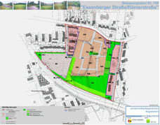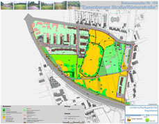 | Es handelt sich um ein Stadterweiterungsprojekt in Siedlungsrandlage mit neuen Wohn- und Mischbereichen sowie ausgedehnten Grünflächen. Die städtebauliche Konzeption wurde seit dem Planungsbeginn im Jahr 2000 mehrfach unter intensiver Bürgerbeteiligung überarbeitet. Das 7,9 ha große Plangebiet ist extrem heterogen strukturiert und weist neben einem aufgegebenen Sportplatz und Kleingärten auch Grünland- und Brachflächen in unterschiedlichen Sukzessionsstadien sowie Wege und Straßenflächen auf. Teile der Bauflächen sind nach § 34 BauGB zu beurteilen, was ebenso wie unterschiedliche Eigentumsverhältnisse in der Beurteilung der Eingriffserheblichkeit und der Erarbeitung von landschaftspflegerischen Maßnahmen und Festsetzungen seinen Niederschlag fand. |