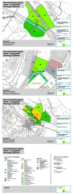 Im Vorfeld der Beauftragung eines Landschaftspflegerischen Begleitplanes wurden die Sanierungsabschnitte ermittelt, bei denen Eingriffe im Sinne der Eingriffsregelung nicht ausgeschlossen werden konnten. Anschließend wurden die verbliebenen Verfahrensbereiche in einem standardisierten Vorgehen beurteilt. Gewählt wurde eine Darstellung in Form von Kennblättern für alle Einzelmaßnahmen, die auch zahlreiche Fotos und Lagepläne umfasst. Für jeden Eingriffsbereich wurden die naturräumlichen Bedingungen beschrieben, Konfliktanalysen erarbeitet und mögliche Vermeidungs-, Minderungs- und Gestaltungsmaßnahmen formuliert. |