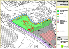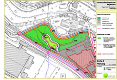 Das Regenrückhaltebecken stellt aufgrund seiner Lage im Überschwemmungsgebiet des Deilbaches eine besondere landschaftsökologische Herausforderung dar. Obgleich die Aue deutliche Überformungen aufweist, ist eine Genehmigungsfähigkeit nur dadurch gegeben, dass nachgewiesen werden konnte, dass keine alternativen Standorte in Betracht kommen, die zu geringeren Eingriffen führen. Zudem sind durch die Bauweise des Beckens Beeinträchtigungen der Hochwasserabflüsse ausgeschlossen. Zur Kompensation des Eingriffes wird in unmittelbarer Nähe ein verrohrter und in die Mischkanalisation eingebundener Bachlauf wieder offen gelegt und eine Bach-Kanal-Entflechtung realisiert. |
